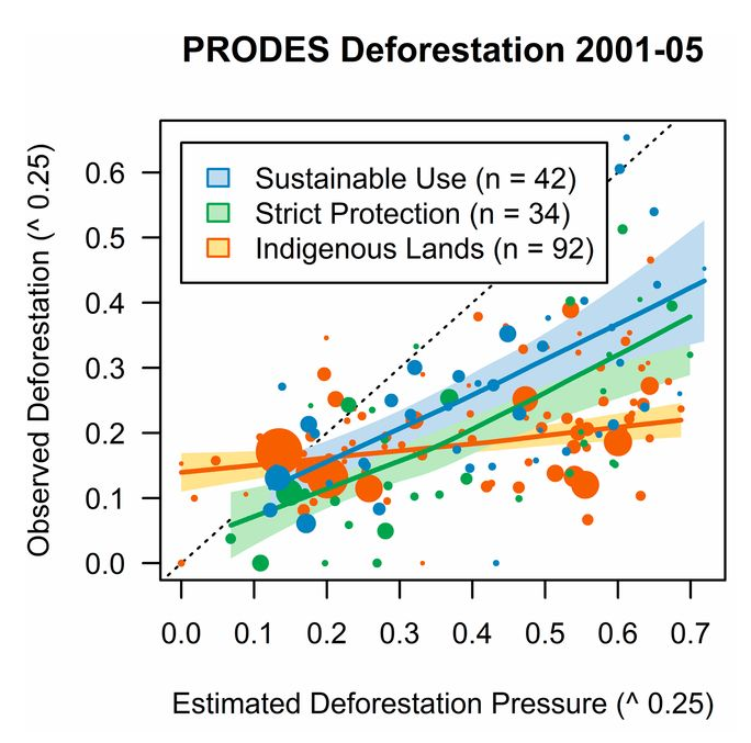 “We show that, for any given level of deforestation pressure, strictly protected areas consistently avoided more deforestation than sustainable use areas. Indigenous lands were particularly effective at avoiding deforestation in locations with high deforestation pressure. Findings were stable across two time periods featuring major shifts in the intensity of government enforcement. We also observed shifting trends in the location of protected areas, documenting that, between 2000 and 2005, strictly protected areas were more likely to be established in high-pressure locations than sustainable use areas and indigenous lands. Our findings confirm that all protection regimes helped reduce deforestation in the Brazilian Amazon.”